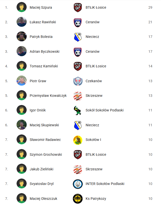 W klasyfikacji strzelców nie zaszły drastyczne zmiany, nadal na czele Maciej Szpura (BTŁiK Łosice) z 29 trafieniami, Łukasz Rawiński (Ceranów) uzbierał 21 bramek, po 17 goli mają Patryk Bolesta (Nieciecz) oraz Adrian Byczkowski (Ceranów). Kolejnymi w klasyfikacji są: Tomasz Kamiński (BTŁiK Łosice; 14 bramek), Piotr Graw (Czekanów; 13), Przemysław Kowalczyk (Skrzeszew; 13), Igor Oniśk (Sokół Sokołów Podlaski; 11), Maciej Skupiewski (Nieciecz; 11), co najmniej 10 trafień mają ponad to: Sławomir Radawiec (Sokołów I), Szymon Grochowski (BTŁiK Łosice), Jakub Zieliński (Skrzeszew), Svyatoslav Dryl (INTER Sokołów Podlaski) oraz Maciej Oleszczuk (Ks Patrykozy).