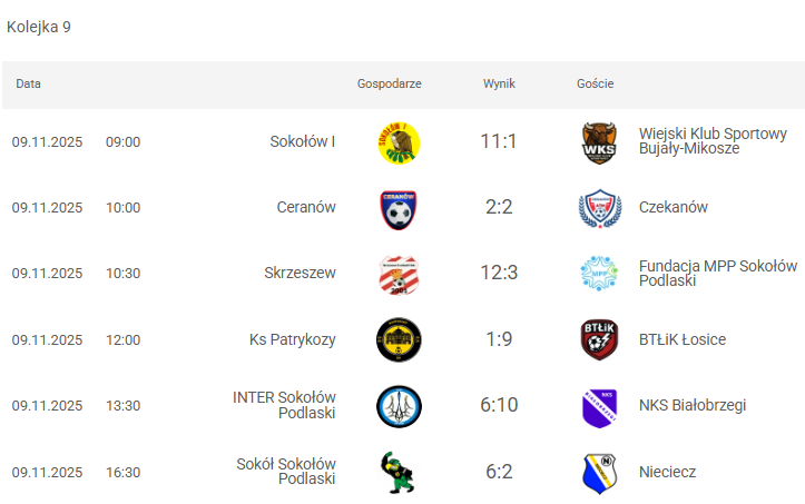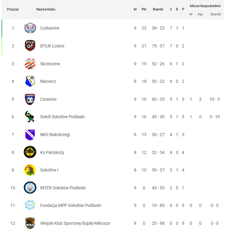 W ligowej tabeli nadal na czele Czekanów, jednak tylko z 1 punktem przewagi nad BTŁiK Łosice, Skrzeszew traci do lidera 3 punkty, a Nieciecz 4, lecz ma jeden mecz mniej rozegrany. Po 16 punktów w swoim dorobku mają Ceranów oraz Sokół Sokołów Podlaski, 13 punktów uzbierał NKS Białobrzegi. Ks Patrykozy zatrzymał się ostatnio na 12 oczkach, a Sokołów I dobił do 10 punktów. Kolejnymi w tabeli są beniaminkowie INTER Sokołów Podlaski z 6 punktami i nadal bez punktów Fundacja MPP Sokołów Podlaski oraz Wiejski Klub Sportowy Bujały-Mikosze.