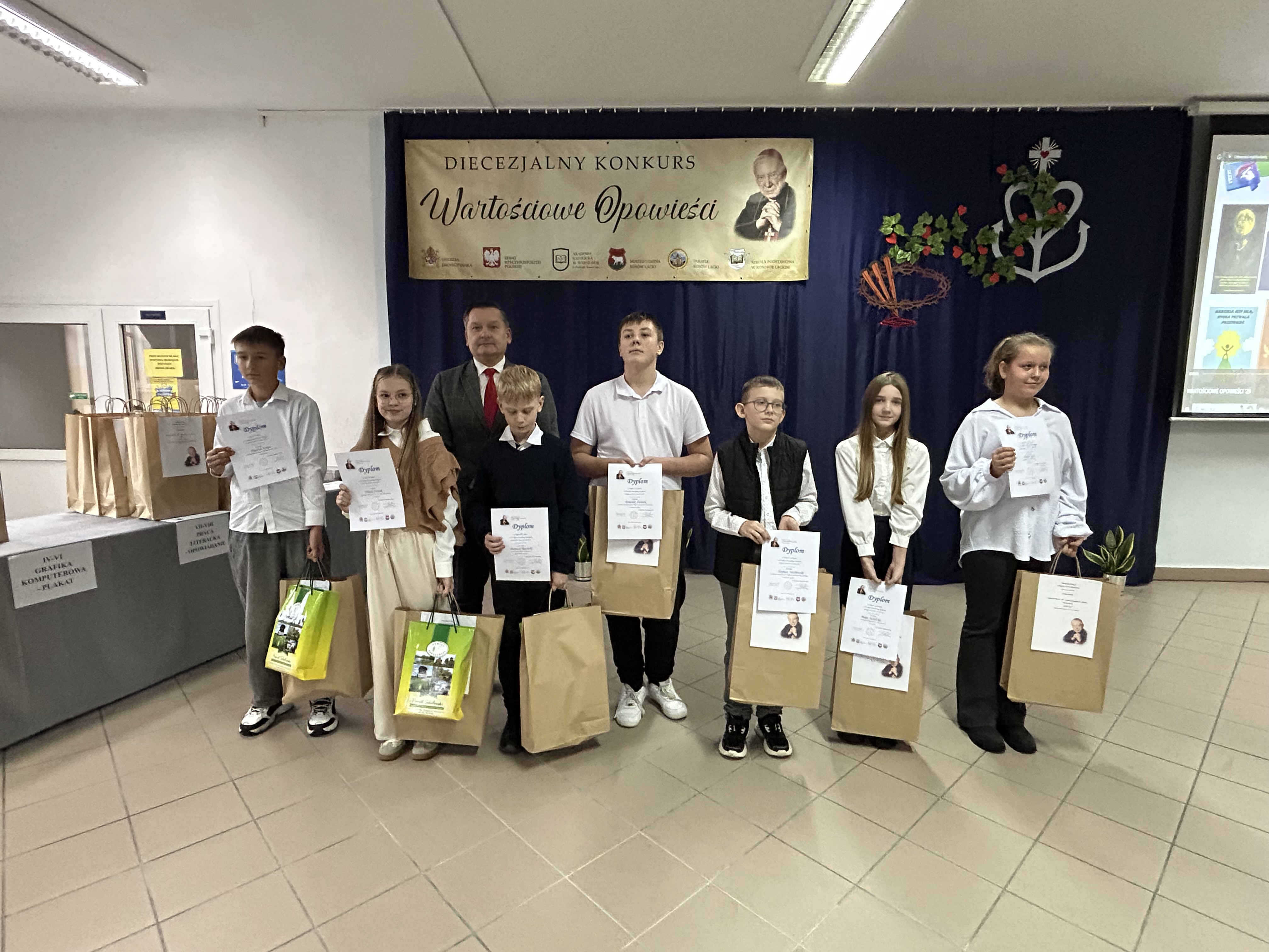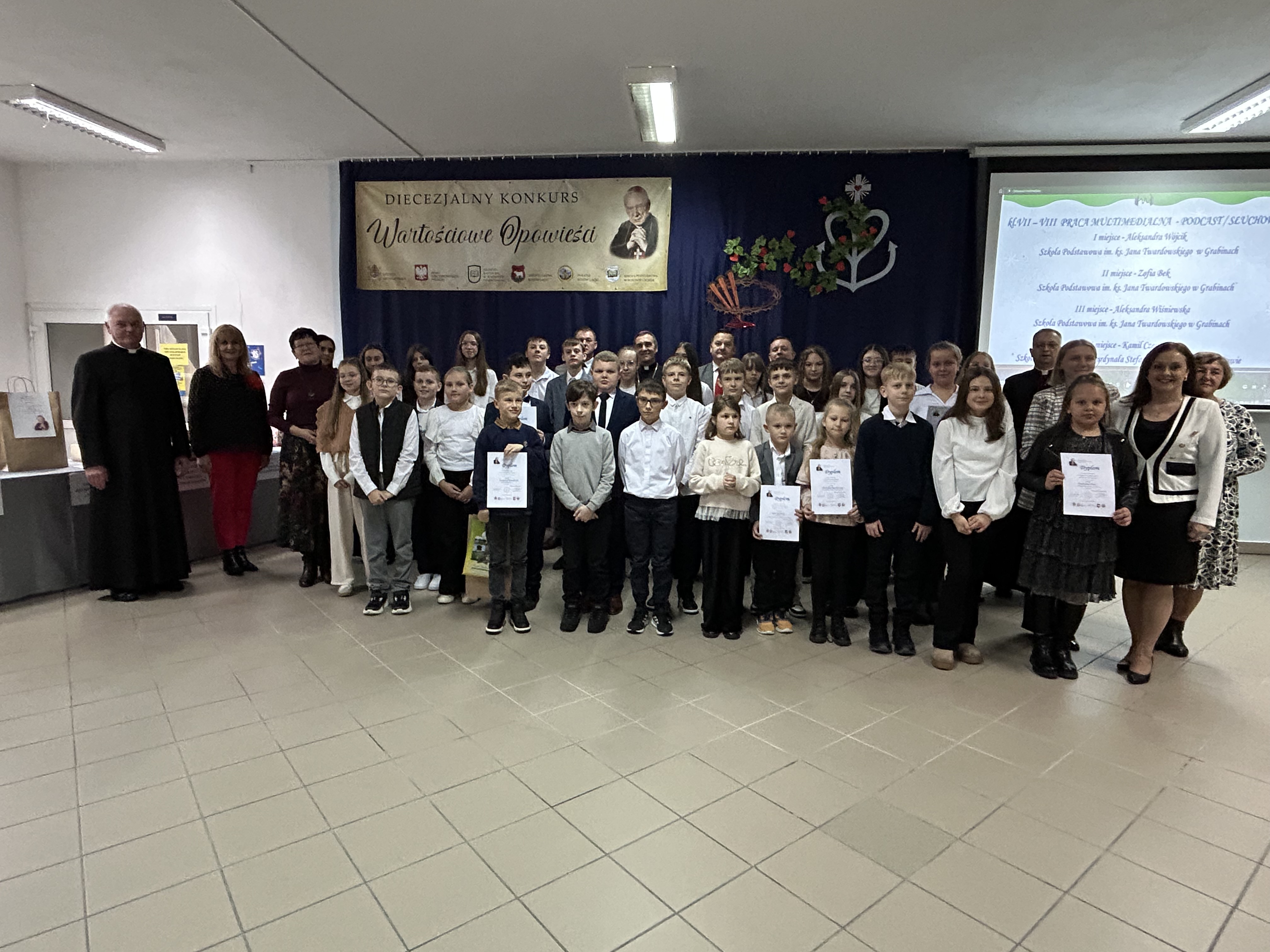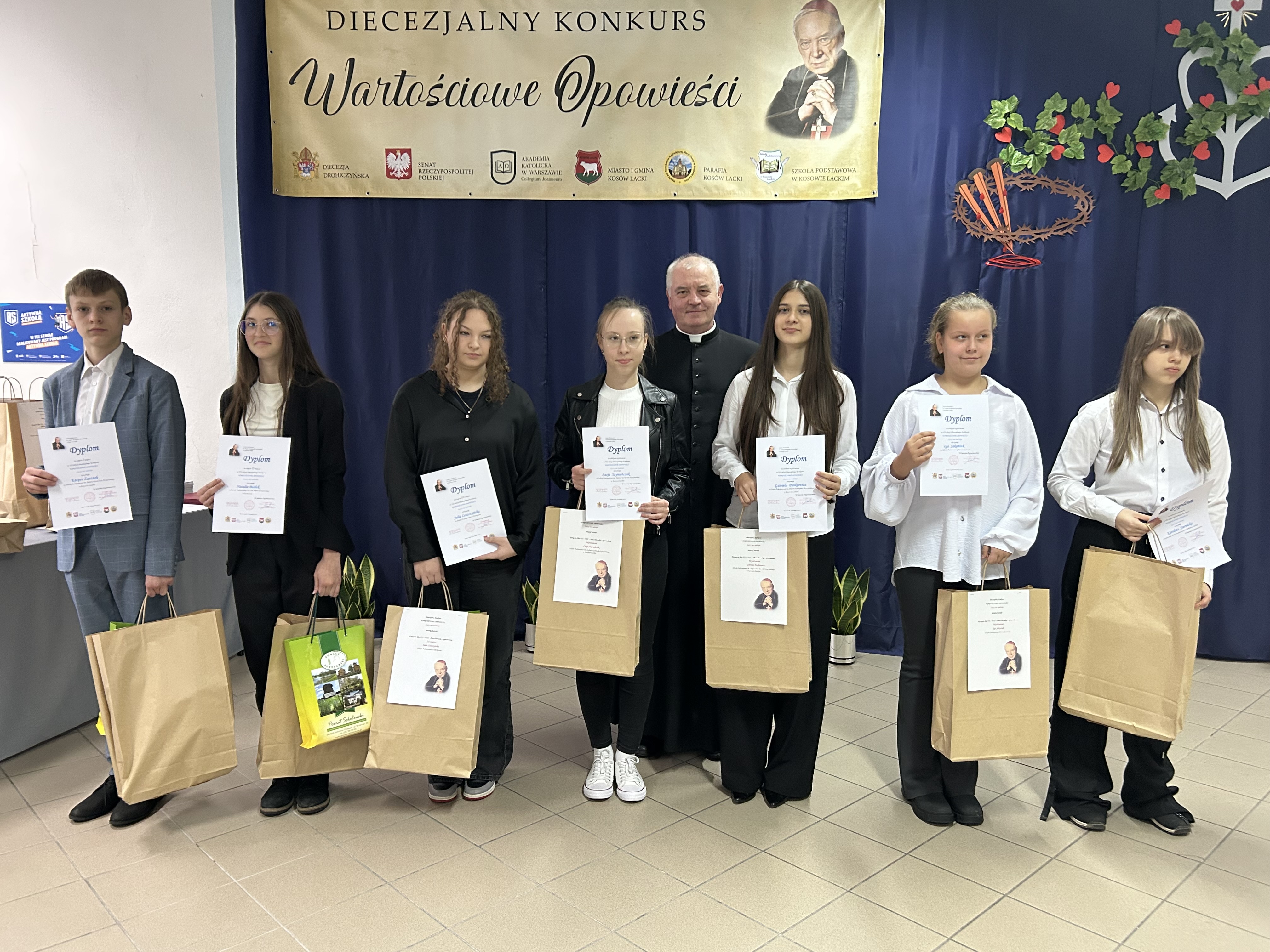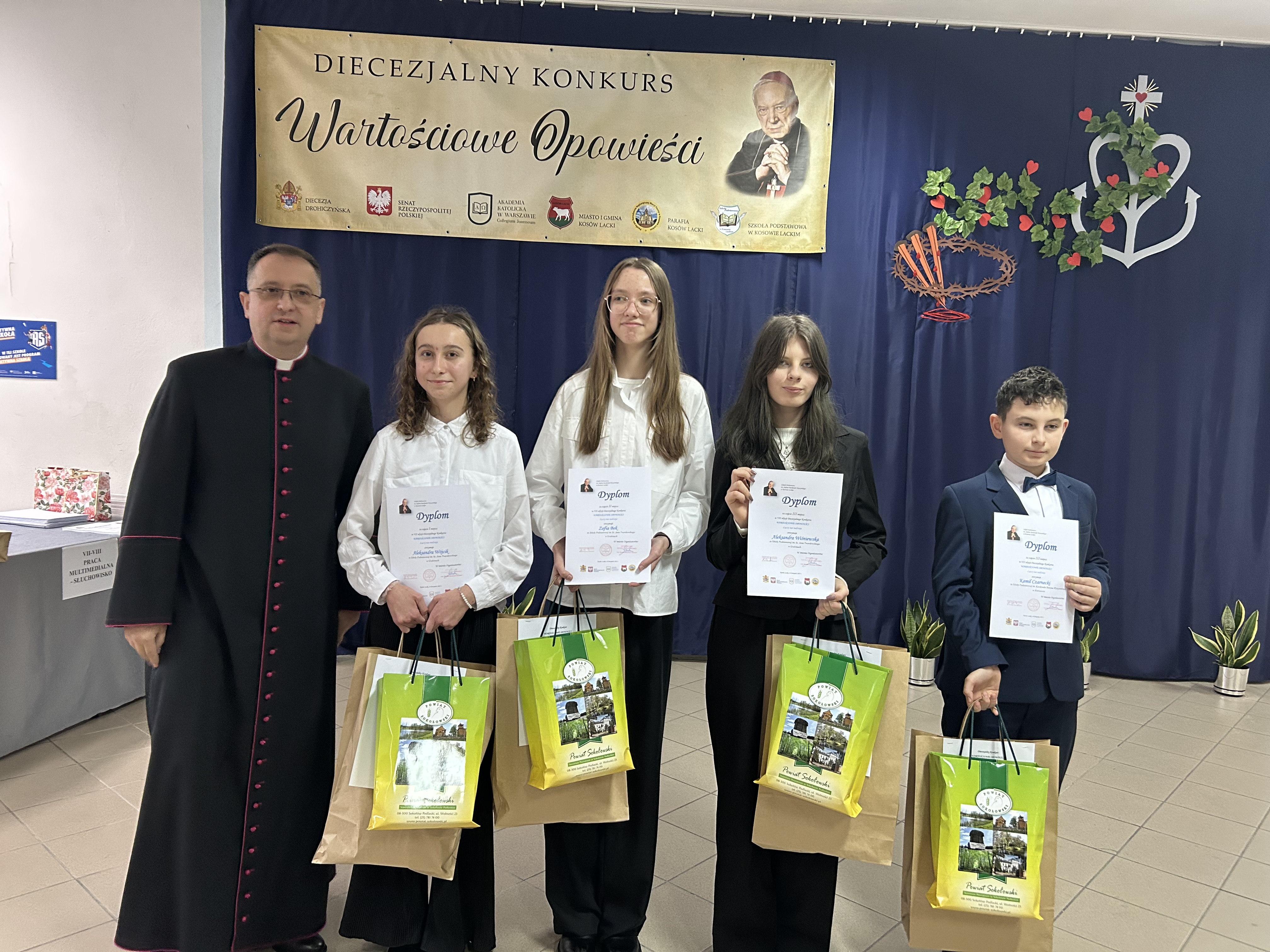 Dnia 26.listopada 2025r. w Szkole Podstawowej im. Stefana Kardynała Wyszyńskiego w Kosowie Lackim odbyła się gala podsumowująca VII edycję Diecezjalnego Konkursu „Wartościowe Opowieści”. Zgromadziła organizatorów, uczestników wraz z rodzicami i opiekunami, a także patronów honorowych i sponsorów nagród. Swoją obecnością uświetnili tę uroczystość znakomici goście: Ksiądz Biskup Piotr Sawczuk, Ordynariusz Diecezji Drohiczyńskiej, Dyrektor Wydziału Katechezy i Szkolnictwa Katolickiego Kurii Diecezjalnej ks. dr Krzysztof Mielnicki, Dyrektor Centrum Informacji Diecezji Drohiczyńskiej ks. Marcin Gołębiewski, Proboszcz Parafii NNMP w Kosowie Lackim, Dziekan Dekanatu Sterdyńskiego Ks. Kan. Paweł Anusiewicz, Wicestarosta Sokołowski p. Zbigniew Czerkas, Przedstawiciel Zarządu Powiatu Sokołowskiego, Dyrektor M – GOK w Kosowie Lackim p. Ewa Olszewska – członkini Komisji Konkursowej, Radny Powiatu Sokołowskiego, p. Sylwester Rytel – Andrianik, reprezentujący Senatora RP p. Waldemara Kraskę, Zastępca Burmistrza Miasta i Gminy Kosów Lacki p. Paweł Nasiłowski.
