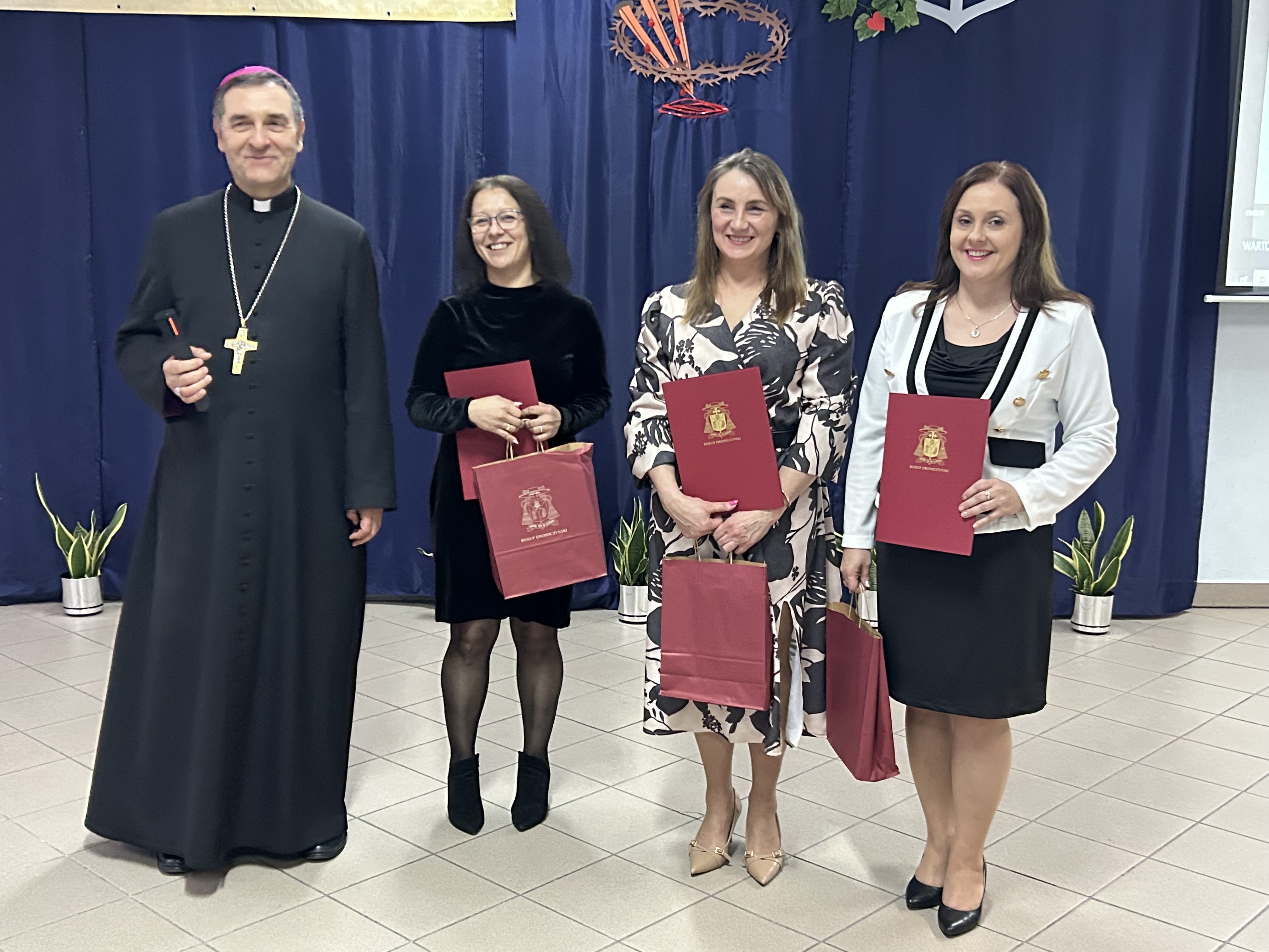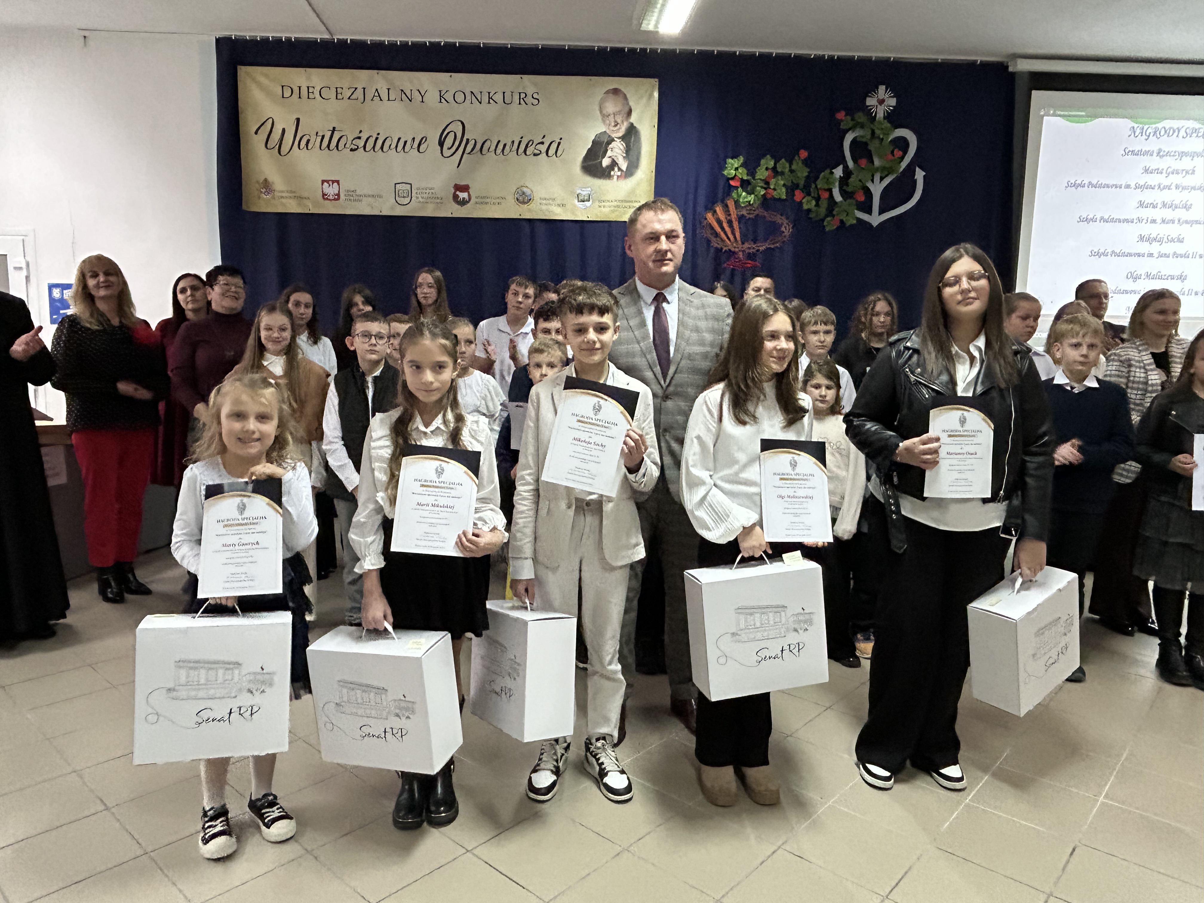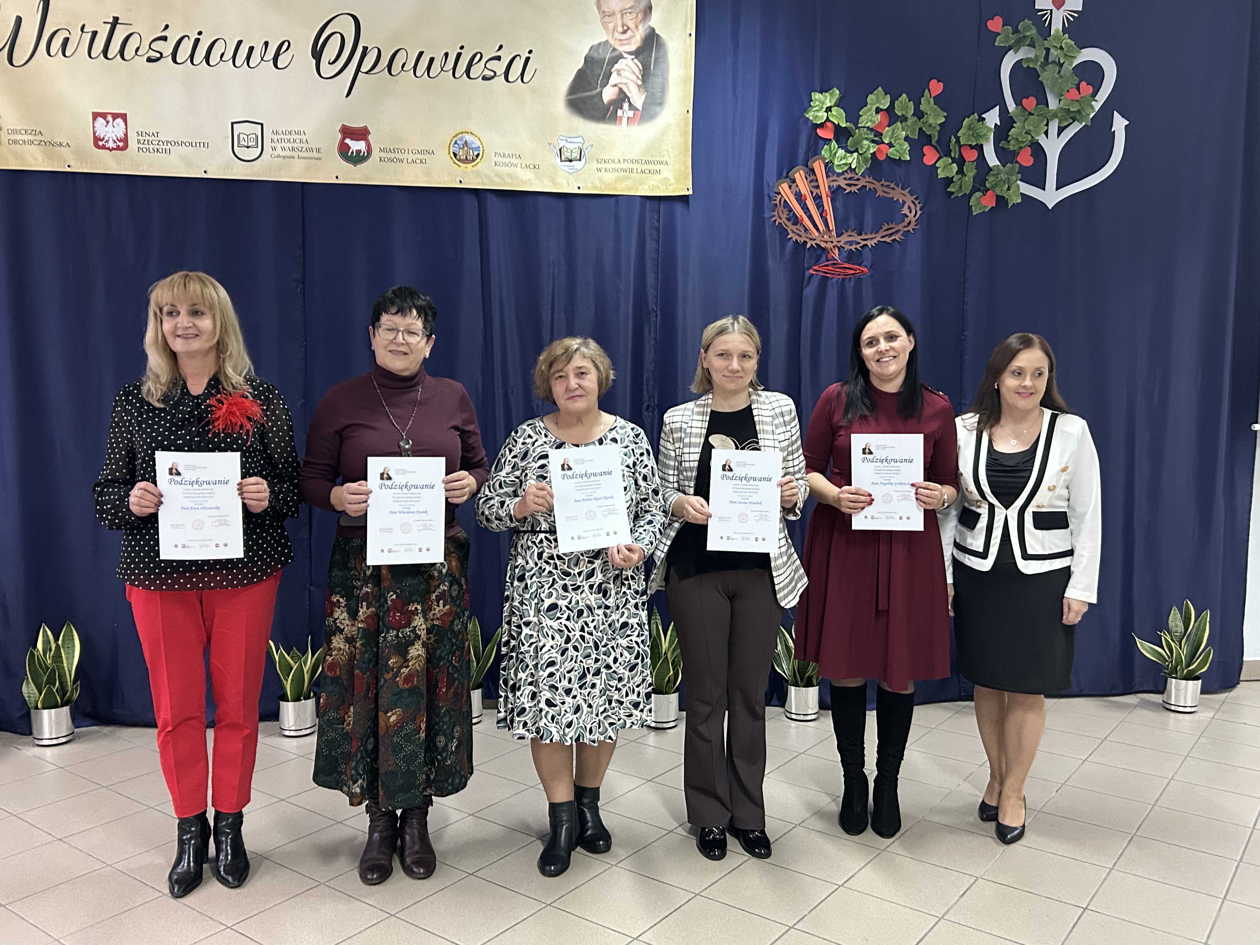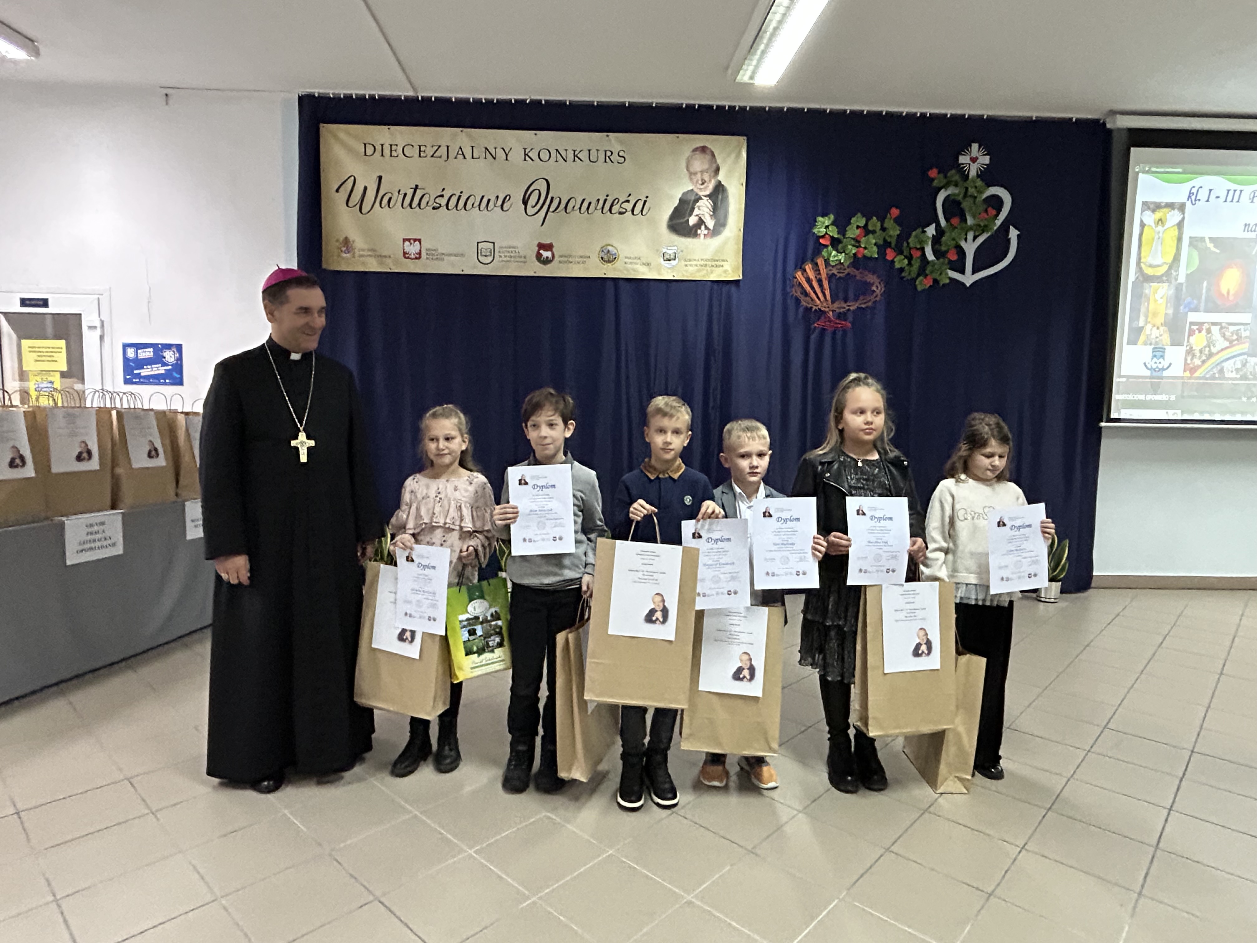 Dnia 26.listopada 2025r. w Szkole Podstawowej im. Stefana Kardynała Wyszyńskiego w Kosowie Lackim odbyła się gala podsumowująca VII edycję Diecezjalnego Konkursu „Wartościowe Opowieści”. Zgromadziła organizatorów, uczestników wraz z rodzicami i opiekunami, a także patronów honorowych i sponsorów nagród. Swoją obecnością uświetnili tę uroczystość znakomici goście: Ksiądz Biskup Piotr Sawczuk, Ordynariusz Diecezji Drohiczyńskiej, Dyrektor Wydziału Katechezy i Szkolnictwa Katolickiego Kurii Diecezjalnej ks. dr Krzysztof Mielnicki, Dyrektor Centrum Informacji Diecezji Drohiczyńskiej ks. Marcin Gołębiewski, Proboszcz Parafii NNMP w Kosowie Lackim, Dziekan Dekanatu Sterdyńskiego Ks. Kan. Paweł Anusiewicz, Wicestarosta Sokołowski p. Zbigniew Czerkas, Przedstawiciel Zarządu Powiatu Sokołowskiego, Dyrektor M – GOK w Kosowie Lackim p. Ewa Olszewska – członkini Komisji Konkursowej, Radny Powiatu Sokołowskiego, p. Sylwester Rytel – Andrianik, reprezentujący Senatora RP p. Waldemara Kraskę, Zastępca Burmistrza Miasta i Gminy Kosów Lacki p. Paweł Nasiłowski.