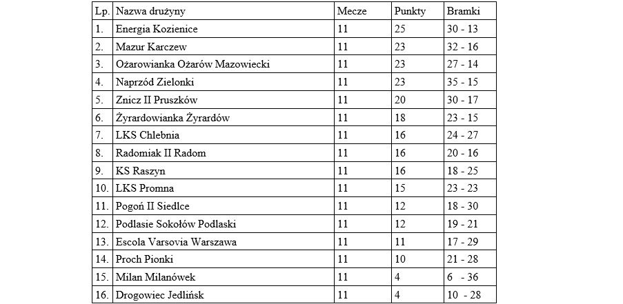 Porażkę Mazura wykorzystała Energia Kozienice pomimo remisu 2:2 w Sokołowie z Podlasiem. Goście dwukrotnie wychodzili na prowadzenie w tym meczu, ale ambitnie grający sokołowianie dwukrotnie doprowadzali do remisu. Jeden punkt pozwolił Energii na zajęcie fotela lidera rozgrywek