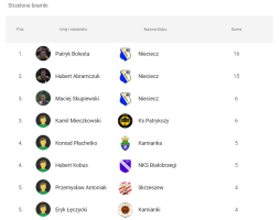 Czołówka klasyfikacji strzelców to trio obrońcy mistrzowskiego tytułu, zespołu Nieciecz: Patryk Bolesta (16 bramek), Hubert Abramczuk (15 goli) oraz Maciej Skupiewski autor 6 trafień, taką samą liczbę bramek ma Kamil Mieczkowski (Ks Patrykozy), po 5 goli strzelili: król strzelców poprzedniego sezonu Konrad Płachetko (Kamianka) oraz Hubert Kobus (NKS Białobrzegi).