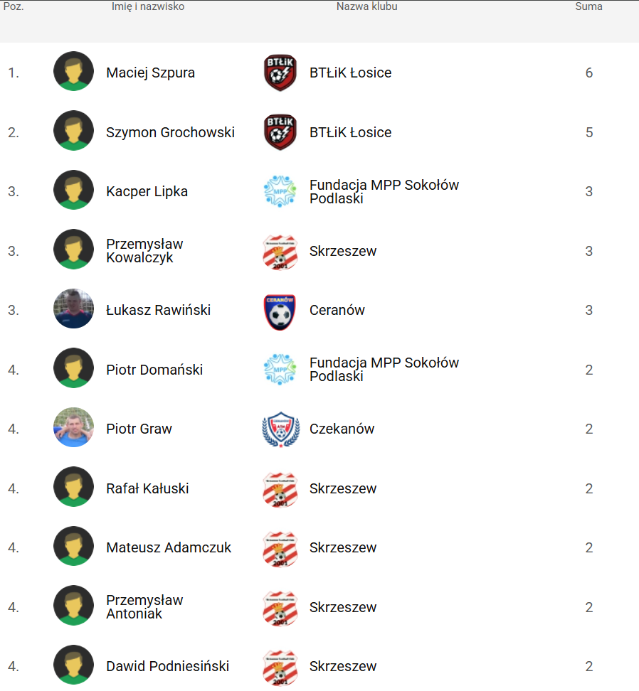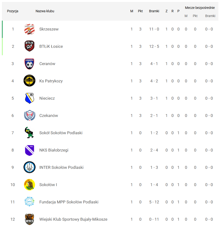 Po pierwszej kolejce na prowadzeniu (dzięki bilansowi bramkowemu – przyp. autora) Skrzeszew, tuż za nim BTŁiK Łosice, Ceranów, Ks Patrykozy, Nieciecz i Czekanów – oto drużyny, które zdobyły komplet punktów.